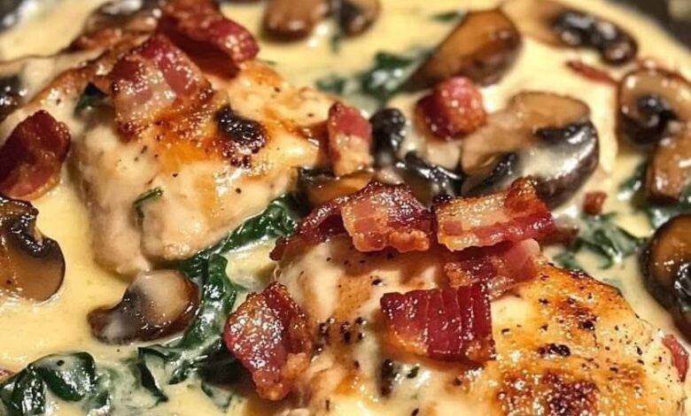 – 🍗 A Culinary Embrace: Smothered Chicken with Creamed Spinach, Bacon, and Mushrooms 🍄