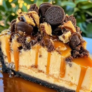 Once the cheesecake has cooled completely (and chilled in the fridge for at least 4 hours or overnight), top it with chopped Reeseβs, crushed Oreos, and mini chocolate chips. Finish it off with a generous drizzle of caramel sauce β and enjoy every sweet, creamy bite!