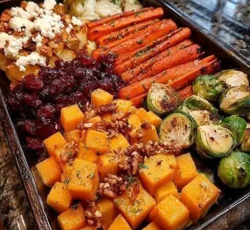 Roasted vegetable dishes are loved for their comforting flavors and nourishing ingredients, and this vibrant recipe brings together some of the best seasonal produce in one colorful tray. Caramelized butternut squash, carrots, Brussels sprouts, and sweet potato are roasted until golden and tender, then finished with creamy feta, crunchy walnuts, and a tangy cranberry-honey glaze. The result is a delicious balance of sweet, savory, and slightly tart flavors that make this dish perfect as a wholesome side or even a satisfying vegetarian main.