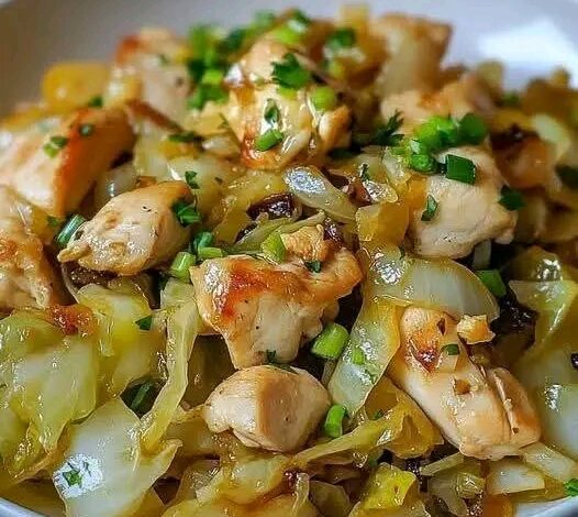 This stir-fry balances juicy, golden chicken with sweet caramelized onions and tender-crisp cabbage. A splash of soy sauce and sesame oil adds depth and aroma, while garlic ties everything together. It’s light yet filling—perfect on its own or served over rice or noodles.