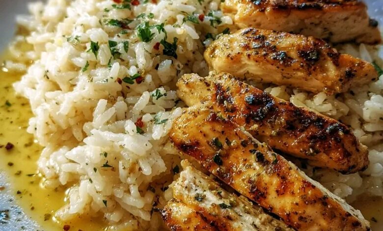 This dish delivers tender, golden chicken drenched in a creamy garlic-Parmesan sauce, balanced by fluffy rice infused with butter and cheese. Every bite is rich without being heavy, making it comforting yet refined.