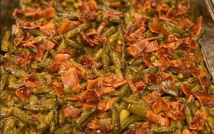 This recipe is a modern American casserole-style side dish that gained popularity through church cookbooks, potlucks, and online recipe sharing. It reflects the Southern U.S. tradition of combining sweet and savory flavors—similar to dishes like green bean casseroles and bacon-braised vegetables often served at Thanksgiving and holiday gatherings.