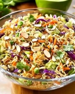 Break the uncooked ramen noodles into small pieces. Toast them in a dry skillet over medium heat for 2–3 minutes, until golden and crispy. Set aside to cool.