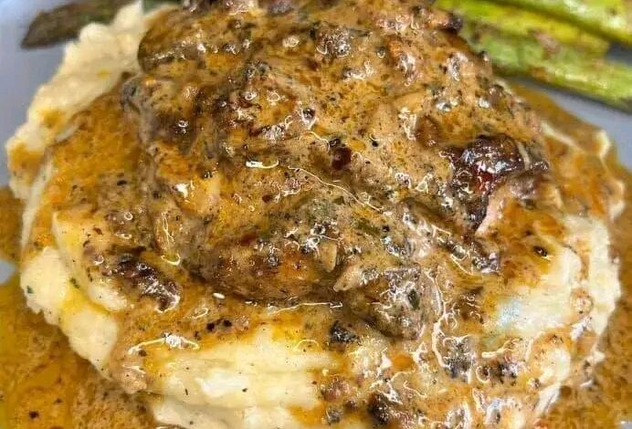 Juicy pan-seared chicken thighs are baked in a velvety cream sauce infused with garlic, herbs, sun-dried tomatoes, and Parmesan cheese. The result is a savory, slightly tangy, and ultra-satisfying dish that pairs beautifully with mashed potatoes, rice, or pasta.