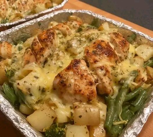 This dish is a rustic oven-baked meal where juicy chicken cubes are roasted alongside seasoned potatoes and green beans. The ingredients absorb savory herbs and spices as they cook together, creating a delicious balance of textures—crispy potatoes, tender chicken, and soft green beans. Everything cooks in one pan, making preparation effortless and cleanup quick.