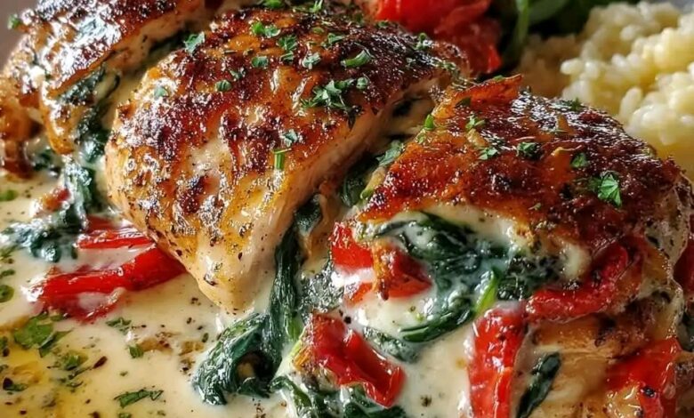 - Roasted Red Pepper, Spinach & Mozzarella Stuffed Chicken