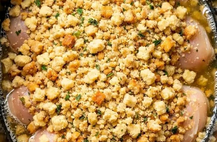 This dish combines moist, slow-cooked chicken breasts with fluffy, herb-seasoned stuffing that absorbs all the savory juices as it cooks. The texture contrast between tender chicken and soft, flavorful stuffing makes every bite satisfying and comforting. It’s the perfect balance of simplicity and homestyle flavor.