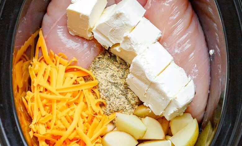3. Top the chicken with cream cheese, cheddar cheese, potatoes, and the ranch seasoning mix.